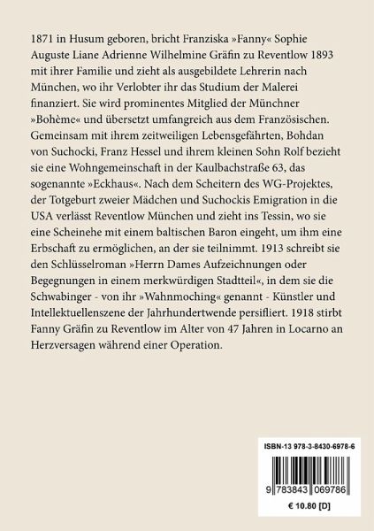 1871 in Husum geboren, bricht Franziska "Fanny" Sophie Auguste Liane Adrienne Wilhelmine Gräfin zu Reventlow 1893 mit ihrer Familie und zieht als ausgebildete Lehrerin nach München, wo ihr Verlobter ihr das Studium der Malerei finanziert. Sie wird prominentes Mitglied der Münchner "Bohème" und übersetzt umfangreich aus dem Französischen. Gemeinsam mit ihrem zeitweiligen Lebensgefährten, Bohdan von Suchocki, Franz Hessel und ihrem kleinen Sohn Rolf bezieht sie eine Wohngemeinschaft in der Kaulbachstraße 63, das sogenannte "Eckhaus". Nach dem Scheitern des WG-Projektes, der Totgeburt zweier Mädchen und Suchockis Emigration in die USA verlässt Reventlow München und zieht ins Tessin, wo sie eine Scheinehe mit einem baltischen Baron eingeht, um ihm eine Erbschaft zu ermöglichen, an der sie teilnimmt. 1913 schreibt sie den Schlüsselroman "Herrn Dames Aufzeichnungen oder Begegnungen in einem merkwürdigen Stadtteil", in dem sie die Schwabinger - von ihr "Wahnmoching" genannt - Künstler und Intellektuellenszene der Jahrhundertwende persifliert. 1918 stirbt Fanny Gräfin zu Reventlow im Alter von 47 Jahren in Locarno an Herzversagen während einer Operation.