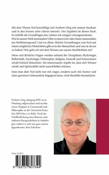 Mit dem Thema Tod beschäftigt sich Norbert Görg seit seinem Studium und in den letzten zehn Jahren intensiv. Das Ergebnis ist dieses Buch. Es enthält die Grundfragen des Lebens mit einigen Lösungsansätzen: Wie ist unsere Welt entstanden? Gibt es einen Gott oder einen transzendenten Welthintergrund? Und vor allem: Welche Vorstellungen vom Tod und einem möglichen Weiterleben gibt es in der Menschheit und was ist davon zu halten? Wie gehe ich mit dem Wissen um unsere Sterblichkeit um?Diese und ähnliche Fragen werden anhand der Disziplinen Mythologie, Belletristik, Psychologie, Philosophie, Religion, Esoterik und Naturwissenschaft kritisch beleuchtet. Ein interessanter Aspekt ist, dass sich Wissenschaft und Spiritualität nicht ausschließen müssen.Dass man dem Tod nicht nur mit Angst, sondern auch mit Humor und einer gewissen Gelassenheit begegnen kann, wird ebenfalls thematisiert.