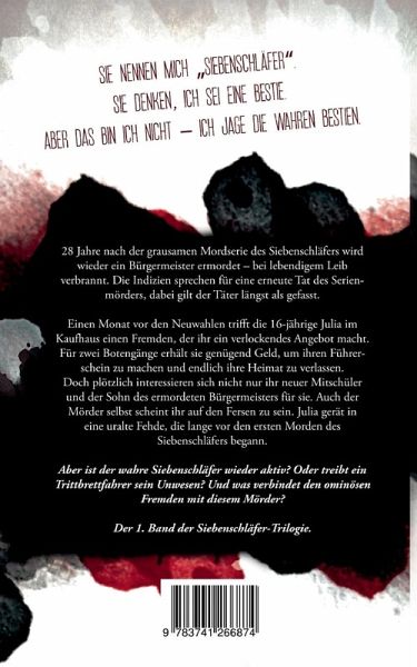 Sie nennen mich "Siebenschläfer". Sie denken, ich sei eine Bestie.Aber das bin ich nicht - Ich jage die wahren Bestien.28 Jahre nach der grausamen Mordserie des Siebenschläfers wird wieder ein Bürgermeister ermordet - bei lebendigem Leib verbrannt. Die Indizien sprechen für eine erneute Tat des Serienmörders, dabei gilt der Täter längst als gefasst.Einen Monat vor den Neuwahlen trifft die 16-jährige Julia im Kaufhaus einen Fremden, der ihr ein verlockendes Angebot macht. Für zwei Botengänge erhält sie genügend Geld, um ihren Führerschein zu machen und endlich ihre Heimat zu verlassen. Doch plötzlich interessieren sich nicht nur ihr neuer Mitschüler und der Sohn des ermordeten Bürgermeisters für sie. Auch der Mörder selbst scheint ihr auf den Fersen zu sein. Julia gerät in eine uralte Fehde, die lange vor den ersten Morden des Siebenschläfers begann.Aber ist der wahre Siebenschläfer wieder aktiv? Oder treibt ein Trittbrettfahrer sein Unwesen? Und was verbindet den ominösen Fremdenmit diesem Mörder?