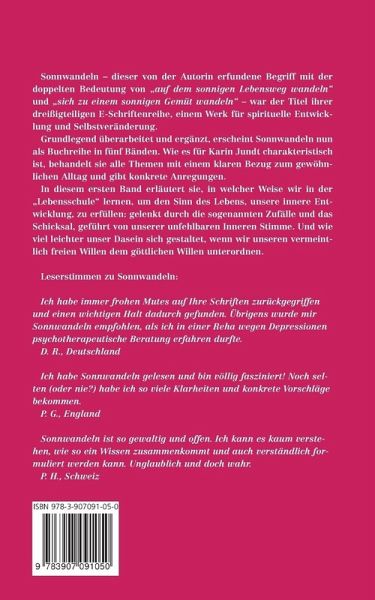 Sonnwandeln - dieser von der Autorin erfundene Begriff mit der doppelten Bedeutung von "auf dem sonnigen Lebensweg wandeln" und "sich zu einem sonnigen Gemüt wandeln" - war der Titel ihrer dreißigteiligen E-Schriftenreihe, einem Werk für spirituelle Entwicklung und Selbstveränderung. Grundlegend überarbeitet und ergänzt, erscheint Sonnwandeln nun als Buchreihe in fünf Bänden. Wie es für Karin Jundt charakteristisch ist, behandelt sie alle Themen mit einem klaren Bezug zum gewöhnlichen Alltag und gibt konkrete Anregungen. In diesem ersten Band erläutert sie, in welcher Weise wir in der "Lebensschule" lernen, um den Sinn des Lebens, unsere innere Entwicklung, zu erfüllen: gelenkt durch die sogenannten Zufälle und das Schicksal, geführt von unserer unfehlbaren Inneren Stimme. Und wie viel leichter unser Dasein sich gestaltet, wenn wir unseren vermeintlich freien Willen dem göttlichen Willen unterordnen. Inhaltsverzeichnis: Einleitung Auf dem Sonnwandeln-Weg 1. Der Sinn des Lebens und unsere Lebensaufgabe 2. Lebensphasen und Lebenskrisen 3. Zufall und Schicksal 4. Freier Wille oder Vorbestimmung? 5. Wille und Wollen 6. Unsere Innere Stimme Ein kurzes Schlusswort
