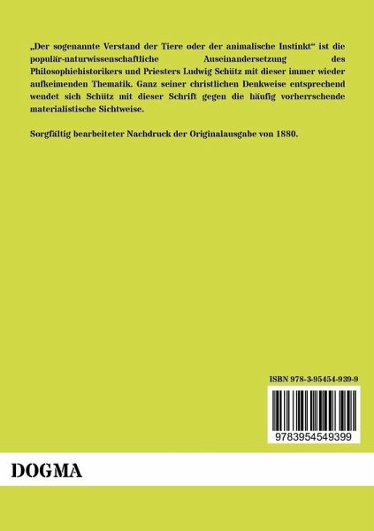 Der sogenannte Verstand der Tiere oder der animalische Instinkt ist die populär-naturwissenschaftliche Auseinandersetzung des Philosophiehistorikers und Priesters Ludwig Schütz mit dieser immer wieder aufkeimenden Thematik. Ganz seiner christlichen Denkweise entsprechend wendet sich Schütz mit dieser Schrift gegen die häufig vorherrschende materialistische Sichtweise.