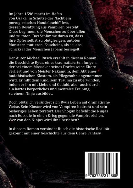 Im Jahre 1596 macht im Hafen von Osaka im Schutze der Nacht ein portugiesisches Handelsschiff fest, dessen Besatzung aus Vampiren besteht. Diese beginnen, die Menschen zu überfallen und zu töten. Das Schlimme daran ist, dass ihre Opfer selbst zu blutgierigen, untoten Monstern mutieren. Es scheint, als sei das Schicksal der Menschen Japans besiegelt. Der Autor Michael Rusch erzählt in diesem Roman die Geschichte Ryus, eines traumatisierten Jungen, der bei einem Massaker seines Dorfes seine Eltern verliert und von Meister Nakamura, dem Abt eines buddhistischen Klosters, als Pflegesohn angenommen wird. Er hilft dem Kind, sein Trauma zu überwinden, indem er ihn mit Liebe und Geduld, aber auch durch ein hartes körperliches und mentales Training, zu einem Ninja ausbildet. Doch plötzlich verändert sich Ryus Leben auf dramatische Weise. Sein Kloster wird von Vampiren bedroht und sein bisheriges Leben zerstört. Der Shogun befiehlt die Ninjas nach Edo, die in einen Krieg gegen die Vampire ziehen. Wer von den Ninjas wird ihn überleben?In diesem Roman verbindet Rusch die historische Realität gekonnt mit einer Geschichte aus dem Genre Fantasy.
