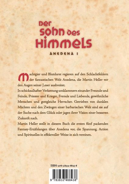 Machtgier und Blutdurst regieren auf den Schlachtfeldern der fantastischen Welt Anedena, die Martin Heller vor den Augen seiner Leser ausbreitet. In schicksalhafter Verkettung umklammern einander Freunde und Feinde, Priester und Krieger, Fremde und Liebende, gewöhnliche Menschen und gottgleiche Herrscher. Getrieben von dunklen Mächten und den Zwängen einer barbarischen Welt sind sie auf der Suche nach dem Glück oder jagen ihrer Vision einer besseren Zukunft nach.Martin Heller stellt in diesem Buch die ersten fünf packenden Fantasy-Erzählungen über Anedena vor, die Spannung, Action und Spirituelles in effektvoller Weise in sich vereinen.