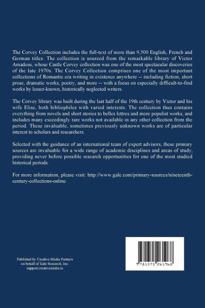 Nineteenth Century Collections Online: European Literature, 1790-1840: The Corvey Collection includes the full-text of more than 9,500 English, French and German titles. The collection is sourced from the remarkable library of Victor Amadeus, whose Castle Corvey collection was one of the most spectacular discoveries of the late 1970s. The Corvey Collection comprises one of the most important collections of Romantic era writing in existence anywhere -- including fiction, short prose, dramatic works, poetry, and more -- with a focus on especially difficult-to-find works by lesser-known, historically neglected writers. The Corvey library was built during the last half of the 19th century by Victor and his wife Elise, both bibliophiles with varied interests. The collection thus contains everything from novels and short stories to belles lettres and more populist works, and includes many exceedingly rare works not available in any other collection from the period. These invaluable, sometimes previously unknown works are of particular interest to scholars and researchers. European Literature, 1790-1840: The Corvey Collection includes: * Novels and Gothic Novels * Short Stories * Belles-Lettres * Short Prose Forms * Dramatic Works * Poetry * Anthologies * And more Selected with the guidance of an international team of expert advisors, these primary sources are invaluable for a wide range of academic disciplines and areas of study, providing never before possible research opportunities for one of the most studied historical periods. Additional Metadata Primary Id: B0815500 PSM Id: NCCOF0063-C00000-B0815500 DVI Collection Id: NCCOC0062 Bibliographic Id: NCCO007445 Reel: 6157 MCODE: 4UVC Original Publisher: Druck and Verlag von B. G. Teubner Original Publication Year: 1852 Original Publication Place: Leipzig Subjects German fiction -- 19th century