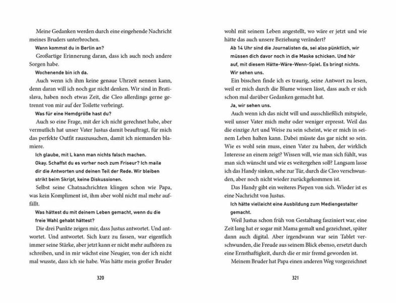Dabei ist er auch nicht besser dran, traut sich nicht, einen Ausweg aus der Zukunft zu suchen, die sein Vater bestimmt. Cleo rät ihm: „Niemand sollte unglücklich mit seinem Leben sein, weil er Dinge tut, die andere erwarten.“ (S. 387) Gabriel ist ein Getriebener, will unbedingt ganz schnell nach Budapest, ohne ihr zu sagen, warum. Trotzdem machen beide Umwege, um Zeit miteinander verbringen zu können. Doch das reale Leben ist in Form von Nachrichten und Anrufen ihrer Freunde und Familien im Gepäck und lässt sich nicht vollends ausblenden. Immer mehr Probleme und Geheimnisse kommen ans Licht – werden die sie am Ende trennen oder zusammenführen?