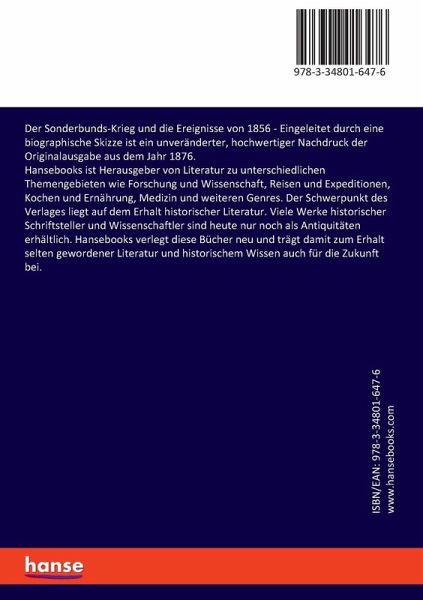 Der Sonderbunds-Krieg und die Ereignisse von 1856 - Eingeleitet durch eine biographische Skizze ist ein unveränderter, hochwertiger Nachdruck der Originalausgabe aus dem Jahr 1876.Hansebooks ist Herausgeber von Literatur zu unterschiedlichen Themengebieten wie Forschung und Wissenschaft, Reisen und Expeditionen, Kochen und Ernährung, Medizin und weiteren Genres. Der Schwerpunkt des Verlages liegt auf dem Erhalt historischer Literatur. Viele Werke historischer Schriftsteller und Wissenschaftler sind heute nur noch als Antiquitäten erhältlich. Hansebooks verlegt diese Bücher neu und trägt damit zum Erhalt selten gewordener Literatur und historischem Wissen auch für die Zukunft bei.