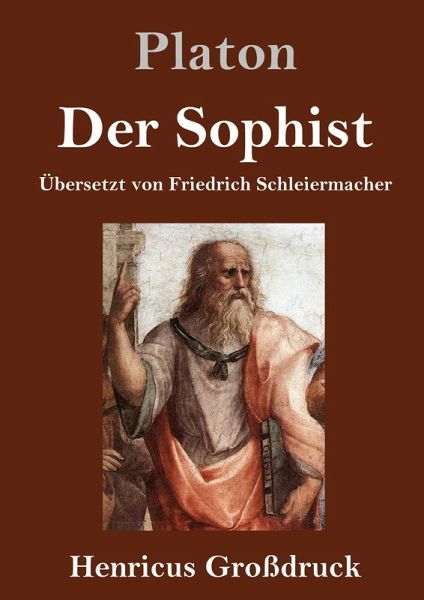 Platon: Der Sophist Lesefreundlicher Großdruck in 16-pt-Schrift Großformat, 210 x 297 mm Berliner Ausgabe, 2021 Durchgesehener Neusatz mit einer Biografie des Autors bearbeitet und eingerichtet von Theodor Borken Entstanden etwa nach 365 v. Chr. Erstdruck (in lateinischer Übersetzung durch Marsilio Ficino) in: Opere, Florenz o. J. (ca. 1482/84). Erstdruck des griechischen Originals in: Hapanta ta tu Platônos, herausgegeben von M. Musoros, Venedig 1513. Erste deutsche Übersetzung durch Johann Friedrich Kleuker in: Werke, 4. Band, Lemgo 1786. Der Text folgt der Übersetzung durch Friedrich Daniel Ernst Schleiermacher von 1807. Textgrundlage ist die Ausgabe: Platon: Sämtliche Werke. Berlin: Lambert Schneider, [1940]. Umschlaggestaltung von Thomas Schultz-Overhage unter Verwendung des Bildes: Raffael, Die Schule von Athen (Detail). Gesetzt aus der Minion Pro, 16 pt. Henricus - Edition Deutsche Klassik GmbH Über den Autor: 428 v. Chr. in Athen als jüngstes von vier Kindern des Ariston in die wohlhabende attische Elite hineingeboren, genießt Platon eine umfassende Erziehung in Malerei, Musik und Dichtung. Kratylos, ein Anhänger Heraklits, führt ihn in die Philosophie ein. 20-jähring begegnet er seinem Lebensmenschen Sokrates, schließt sich ihm als Schüler an und bleibt bis zu dessen Hinrichtung 399 v. Chr. bei ihm. Er verachtet die politische Führung Athens und fordert die Herrschaft der Philosophen. Seine Versuche mit Hilfe des Politikers Dion einen philosophischen Staat auf Sizilien zu errichten schlagen fehl. 387 v. Chr. kauft er ein Grundstück im Nordwesten von Athen und gründet mit seiner »Akademie« die erste Philosophenschule Griechenlands. Dort lebt und lehrt er ¿ unterbrochen von längeren Reisen ¿ bis zu seinem Tod im Jahr 347 v. Chr. Platon hinterlässt mehrere Dutzend seiner legendär gewordenen Dialoge, von denen viele verloren gegangen sind, andere ihm fälschlich zugeschrieben werden. Unverrückbar bis heute ist sein Begriff der Idee, der ihn zu einer der wirkungsmächtigsten Figuren der Geistesgeschichte macht.