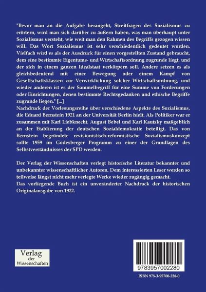 Nachdruck der Vorlesungsreihe über verschiedene Aspekte des Sozialismus, die Eduard Bernstein 1921 an der Universität Berlin hielt. Als Politiker war er zusammen mit Karl Liebknecht, August Bebel und Karl Kautsky maßgeblich an der Etablierung der deutschen Sozialdemokratie beteiligt. Das von Bernstein begründete revisionistisch-reformistische Sozialismuskonzept sollte 1959 im Godesberger Programm zu einer der Grundlagen des Selbstverständnisses der SPD werden.