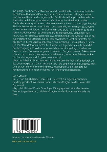In der sozialen Arbeit wird die Sozialraumorientierung als Paradigma diskutiert. Das Buch stellt einen qualitativen Ansatz vor, um Lebenswelten von Kindern und Jugendlichen besser verstehen zu können als Grundlage einer Maßnahmeplanung in der Jugendarbeit und anderer Bereichen. Grundlage für Konzeptentwicklung und Qualitätsarbeit ist eine gründliche Bedarfsermittlung und Planung für die Offene Kinder- und Jugendarbeit und andere Bereiche der Jugendhilfe. Das Buch stellt erprobte Modelle und theoretische Erklärungsmuster zur Verfügung. Im Mittelpunkt stehen Methoden einer qualitativen Lebensweltanalyse. Eine solche Analyse hat das Ziel, die Lebenswelten von Kindern und Jugendlichen in einem Sozialraum zu verstehen und daraus Anforderungen und Ziele für Arbeit zu formulieren. Nadelmethode, strukturierte Stadtteilbegehung, Cliquenporträts, Interviews mit Schlüsselpersonen usw. sind methodische Ansätze, die in der Jugendarbeit zur Erforschung der lebensweltlichen Sicht bestimmter Zielgruppen in ihrem sozialräumlichen Zusammenhang Einzug gehalten haben. Die meisten Methoden bieten für Kinder und Jugendliche ein hohes Maß der Beteiligung und Aktivierung, weil diese nicht abgefragt, sondern zu Experten ihres Sozialraums gemacht werden. Die gewonnenen Erkenntnisse können dazu dienen, Konzepte zu qualifizieren, etwa neue Schwerpunkte für Einrichtungen und Projekte zu entwickeln. Über die Arbeit in Einrichtungen hinaus werden die Fachkräfte dadurch zu Sozialraumexperten. Damit verändert sich die Legitimation der Jugendarbeit und erlaubt die Wahrnehmung eines jugendpolitischen Mandats zurRevitalisierung öffentlicher Räume für Kinder und Jugendliche.