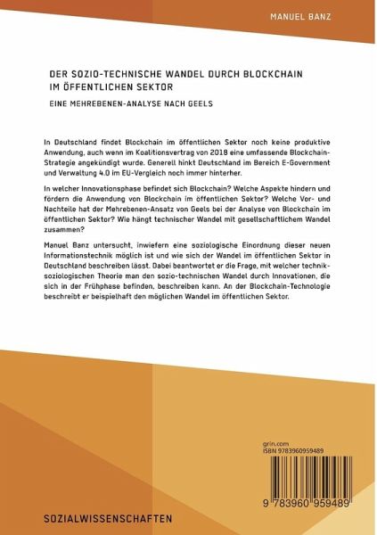 In Deutschland findet Blockchain im öffentlichen Sektor noch keine produktive Anwendung, auch wenn im Koalitionsvertrag von 2018 eine umfassende Blockchain-Strategie angekündigt wurde. Generell hinkt Deutschland im Bereich E-Government und Verwaltung 4.0 im EU-Vergleich noch immer hinterher. In welcher Innovationsphase befindet sich Blockchain? Welche Aspekte hindern und fördern die Anwendung von Blockchain im öffentlichen Sektor? Welche Vor- und Nachteile hat der Mehrebenen-Ansatz von Geels bei der Analyse von Blockchain im öffentlichen Sektor? Wie hängt technischer Wandel mit gesellschaftlichem Wandel zusammen?Manuel Banz untersucht, inwiefern eine soziologische Einordnung dieser neuen Informationstechnik möglich ist und wie sich der Wandel im öffentlichen Sektor in Deutschland beschreiben lässt. Dabei beantwortet er die Frage, mit welcher techniksoziologischen Theorie man den sozio-technischen Wandel durch Innovationen, die sich in der Frühphase befinden, beschreiben kann. An der Blockchain-Technologie beschreibt er beispielhaft den möglichen Wandel im öffentlichen Sektor. Aus dem Inhalt: -Sozio-technischer Wandel;-Multi-level Perspective on Technology Transitions;-Frank W. Geels;-Digitalisierung;-Öffentlicher Sektor;-Soziologische Techniktheorie