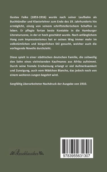 Gustav Falke (1853-1916) wurde nach seiner Laufbahn als Buchhändler und Klavierlehrer zum Ende des 19. Jahrhunderts hin ermöglicht, einzig von seinem schriftstellerischem Schaffen zu leben. Er pflegte fortan beste Kontakte in die Hamburger Literaturszene, in der er hoch geschätzt wurde. Nach anfänglichem Hang zum Impressionismus hat er seinen Weg immer mehr im volkstümlichen und bürgerlichen Stil gesucht, welcher auch die vorliegende Novelle durchzieht.