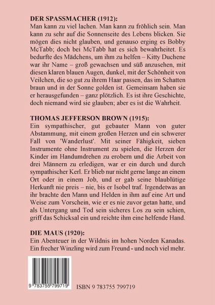 Drei Geschichten von James Oliver Curwood, erschienen in den Jahren 1912, 1915 und 1920DER SPASSMACHER (1912):Man kann zu viel lachen. Man kann zu fröhlich sein. Man kann zu sehr auf die Sonnenseite des Lebens blicken. Sie mögen dies nicht glauben, und genauso erging es Bobby McTabb; doch bei McTabb hat es sich bewahrheitet. Es bedurfte des Mädchens, um ihm zu helfen - Kitty Duchene war ihr Name - groß gewachsen und süß anzusehen, mit diesen klaren blauen Augen, dunkel, mit der Schönheit von Veilchen, die so gut zu ihrem Haar passen, das im Schatten braun und in der Sonne golden ist. Gemeinsam haben sie er herausgefunden - ganz plötzlich. Es ist ihre Geschichte, doch niemand wird sie glauben; aber es ist die Wahrheit.THOMAS JEFFERSON BROWN (1915):Ein sympathischer, gut gebauter Mann von guter Abstammung, mit einem großen Herzen und ein schwerer Fall von 'Wanderlust'. Mit seiner Fähigkeit, sieben Instrumente ohne Instrument zu spielen, die Herzen der Kinder im Handumdrehen zu erobern und die Arbeit von drei Männern zu erledigen, war er ein durch und durch sympathischer Kerl. Er blieb nur nicht gerne lange an einem Ort oder in einem Job, und er gab seine blaublütige Herkunft nie preis - nie, bis er Isobel traf. Irgendetwas an ihr brachte den Mann und Helden in ihm auf eine Art und Weise zum Vorschein, wie er es nie zuvor getan hatte, und als Untergang und Tod sein sicheres Los zu sein schien, griff das Schicksal ein und reichte ihm eine helfende Hand.DIE MAUS (1920):Ein Abenteuer in der Wildnis im hohen Norden Kanadas. Ein frecher Winzling wird zum Freund - und noch viel mehr.