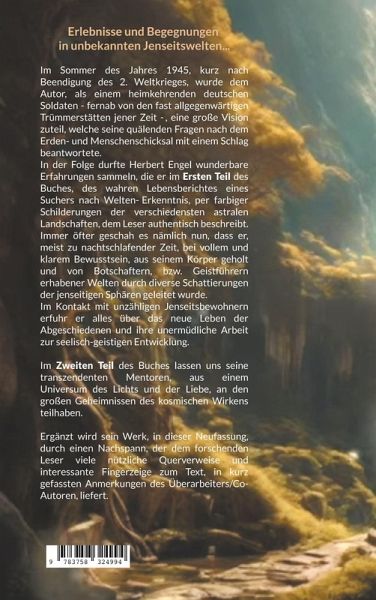 Erlebnisse und Begegnungen in unbekannten Jenseitswelten...Im Sommer des Jahres 1945, kurz nach Beendigung des 2. Weltkrieges, wurde dem Autor, als einem heimkehrenden deutschen Soldaten - fernab von den fast allgegenwärtigen Trümmerstätten jener Zeit -, eine große Vision zuteil, welche seine quälenden Fragen nach dem Erden- und Menschenschicksal mit einem Schlag beantwortete.In der Folge durfte Herbert Engel wunderbare Erfahrungen sammeln, die er im Ersten Teil des Buches, des wahren Lebensberichtes eines Suchers nach Welten-Erkenntnis, per farbiger Schilderungen der verschiedensten astralen Landschaften, dem Leser authentisch beschreibt. Immer öfter geschah es nämlich nun, dass er, meist zu nachtschlafender Zeit, bei vollem und klarem Bewusstsein, aus seinem Körper geholt und von Botschaftern, bzw. Geistführern erhabener Welten durch diverse Schattierungen der jenseitigen Sphären geleitet wurde.Im Kontakt mit unzähligen Jenseitsbewohnern erfuhr er alles über das neue Leben der Abgeschiedenen und ihre unermüdliche Arbeit zur seelisch-geistigen Entwicklung.Im Zweiten Teil des Buches lassen uns seine transzendenten Mentoren, aus einem Universum des Lichts und der Liebe, an den großen Geheimnissen des kosmischen Wirkens teilhaben.Ergänzt wird sein Werk, in dieser Neufassung, durch einen Nachspann, der dem forschenden Leser viele nützliche Querverweise und interessante Fingerzeige zum Text, in kurz gefassten Anmerkungen des Überarbeiters/Co-Autoren, liefert.