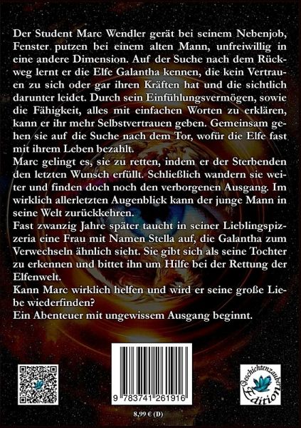 Der Student Marc Wendler gerät bei seinem Nebenjob, Fenster putzen bei einem alten Mann, unfreiwillig in eine andere Dimension. Auf der Suche nach dem Rückweg lernt er die Elfe Galantha kennen, die kein Vertrauen zu sich oder gar ihren Kräften hat und die sichtlich darunter leidet. Durch sein Einfühlungsvermögen, sowie die Fähigkeit, alles mit einfachen Worten zu erklären, kann er ihr mehr Selbstvertrauen geben. Gemeinsam gehen sie auf die Suche nach dem Tor, wofür die Elfe fast mit ihrem Leben bezahlt. Marc gelingt es, sie zu retten, indem er der Sterbenden den letzten Wunsch erfüllt. Schließlich wandern sie weiter und finden doch noch den verborgenen Ausgang. Im wirklich allerletzten Augenblick kann der junge Mann in seine Welt zurückkehren.Fast zwanzig Jahre später taucht in seiner Lieblingspizzeria eine Frau mit Namen Stella auf, die Galantha zum Verwechseln ähnlich sieht. Sie gibt sich als seine Tochter zu erkennen und bittet ihn um Hilfe bei der Rettung der Elfenwelt.Kann Marc wirklich helfen und wird er seine große Liebe wiederfinden?Ein Abenteuer mit ungewissem Ausgang beginnt.