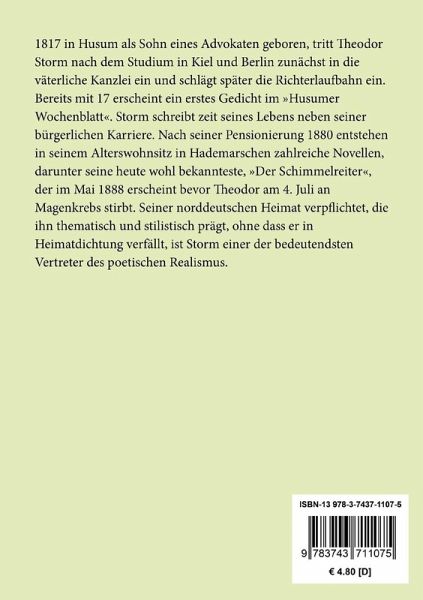 1817 in Husum als Sohn eines Advokaten geboren, tritt Theodor Storm nach dem Studium in Kiel und Berlin zunächst in die väterliche Kanzlei ein und schlägt später die Richterlaufbahn ein. Bereits mit 17 erscheint ein erstes Gedicht im "Husumer Wochenblatt". Storm schreibt zeit seines Lebens neben seiner bürgerlichen Karriere. Nach seiner Pensionierung 1880 entstehen in seinem Alterswohnsitz in Hademarschen zahlreiche Novellen, darunter seine heute wohl bekannteste, "Der Schimmelreiter", der im Mai 1888 erscheint bevor Theodor am 4. Juli an Magenkrebs stirbt. Seiner norddeutschen Heimat verpflichtet, die ihn thematisch und stilistisch prägt, ohne dass er in Heimatdichtung verfällt, ist Storm einer der bedeutendsten Vertreter des poetischen Realismus.