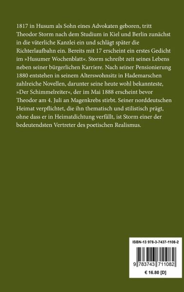 1817 in Husum als Sohn eines Advokaten geboren, tritt Theodor Storm nach dem Studium in Kiel und Berlin zunächst in die väterliche Kanzlei ein und schlägt später die Richterlaufbahn ein. Bereits mit 17 erscheint ein erstes Gedicht im "Husumer Wochenblatt". Storm schreibt zeit seines Lebens neben seiner bürgerlichen Karriere. Nach seiner Pensionierung 1880 entstehen in seinem Alterswohnsitz in Hademarschen zahlreiche Novellen, darunter seine heute wohl bekannteste, "Der Schimmelreiter", der im Mai 1888 erscheint bevor Theodor am 4. Juli an Magenkrebs stirbt. Seiner norddeutschen Heimat verpflichtet, die ihn thematisch und stilistisch prägt, ohne dass er in Heimatdichtung verfällt, ist Storm einer der bedeutendsten Vertreter des poetischen Realismus.