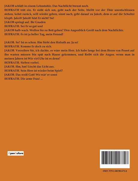 JAKOB schläft in einem Lehnstuhle. Das Nachtlicht brennt noch. HOFRATH tritt ein. Er sieht sich um, geht nach der Seite, bleibt vor der Thür unentschlossen stehen, kehrt zurück, will wieder gehen, sinnt nach, geht darauf zu Jakob, dem er auf die Schulter klopft. Jakob! Jakob! hört Er nicht? he! JAKOB springt auf. Ihr Gnaden HOFRATH. Sei Er so gut und JAKOB halb wach. Wollen Sie zu Bett gehen? Den Augenblick Greift nach dem Nachtlichte. HOFRATH. Es ist ja heller Tag, mein Freund! JAKOB. So? Ist es schon. Hm Sieht den Hofrath an. Ja so! HOFRATH. Komme Er doch zu sich. JAKOB. Verzeihen Sie, ich dachte, es wäre mein Herr. Ich habe lange bei dem Herrn von Posert auf ihn warten müssen bin spät nach Hause gekommen, und Reibt sich die Augen. wenn man in meinen Jahren ist Wie viel Uhr ist es denn? HOFRATH. Sieben vorbei. JAKOB. Hm, hm! Löscht das Licht aus. HOFRATH. Sein Herr ist wieder beim Spiel? JAKOB. Das weiß Gott! Wo wär' er sonst HOFRATH. Die arme Frau! ...