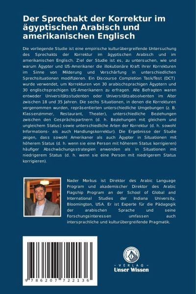 Die vorliegende Studie ist eine empirische kulturübergreifende Untersuchung des Sprechakts der Korrektur im ägyptischen Arabisch und im amerikanischen Englisch. Ziel der Studie ist es, zu untersuchen, wie und warum Ägypter und US-Amerikaner die illokutionäre Kraft ihrer Korrekturen im Sinne von Milderung und Verschärfung in unterschiedlichen Sprechsituationen modifizieren. Ein Discourse Completion Task/Test (DCT) wurde verwendet, um Korrekturen von 30 arabischsprachigen Ägyptern und 30 englischsprachigen US-Amerikanern zu erfragen. Alle Befragten waren entweder Universitätsstudenten oder Universitätsabsolventen im Alter zwischen 18 und 35 Jahren. Die sechs Situationen, in denen die Korrekturen vorgenommen wurden, repräsentierten unterschiedliche Umgebungen (z. B. Klassenzimmer, Restaurant, Theater), unterschiedliche Beziehungen zwischen den Gesprächspartnern (d. h. Beziehungen mit gleichem und ungleichem Status) sowie unterschiedliche Arten der Korrektur (d. h. sowohl Informations- als auch Handlungskorrektur). Die Ergebnisse der Studie zeigen, dass sowohl Amerikaner als auch Ägypter in Situationen mit höherem Status (d. h. wenn sie eine Person mit höherem Status korrigieren) häufiger Abschwächungsstrategien anwenden als in Situationen mit niedrigerem Status (d. h. wenn sie eine Person mit niedrigerem Status korrigieren).
