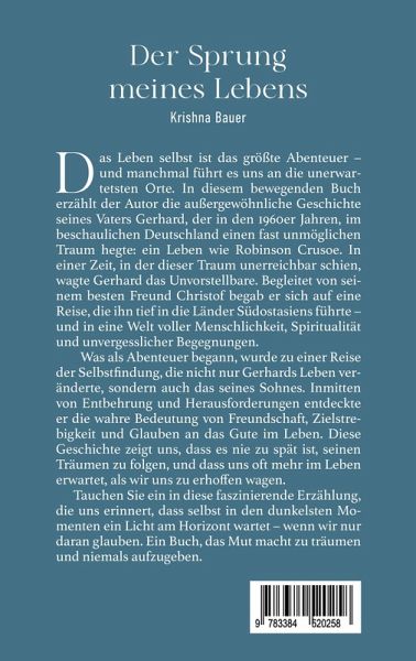 Das Leben selbst ist das größte Abenteuer - und manchmal führt es uns an die unerwartetsten Orte. In diesem bewegenden Buch erzählt der Autor die außergewöhnliche Geschichte seines Vaters Gerhard, der in den 1960er Jahren, im beschaulichen Deutschland einen fast unmöglichen Traum hegte: ein Leben wie Robinson Crusoe. In einer Zeit, in der dieser Traum unerreichbar schien, wagte Gerhard das Unvorstellbare. Begleitet von seinem besten Freund Christof begab er sich auf eine Reise, die ihn tief in die Länder Südostasiens führte - und in eine Welt voller Menschlichkeit, Spiritualität und unvergesslicher Begegnungen.Was als Abenteuer begann, wurde zu einer Reise der Selbstfindung, die nicht nur Gerhards Leben veränderte, sondern auch das seines Sohnes. Inmitten von Entbehrung und Herausforderungen entdeckte er die wahre Bedeutung von Freundschaft, Zielstrebigkeit und Glauben an das Gute im Leben. Diese Geschichte zeigt uns, dass es nie zu spät ist, seinen Träumen zu folgen, und dass uns oft mehr im Leben erwartet, als wir uns zu erhoffen wagen.Tauchen Sie ein in diese faszinierende Erzählung, die uns erinnert, dass selbst in den dunkelsten Momenten ein Licht am Horizont wartet - wenn wir nur daran glauben. Ein Buch, das Mut macht zu träumen und niemals aufzugeben.