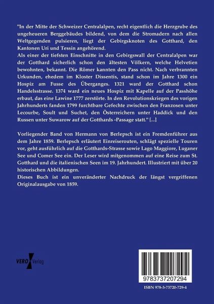 Vorliegender Band von Hermann von Berlepsch ist ein Fremdenführer aus dem Jahre 1859. Berlepsch erläutert Einreiserouten, schlägt spezielle Touren vor, geht ausführlich auf die Gotthards-Strasse sowie Lago Maggiore, Luganer See und Comer See ein. Der Leser wird mitgenommen auf eine Reise zum St. Gotthard und die italienischen Seen im 19. Jahrhundert. Illustriert mit über 20 historischen Abbildungen.