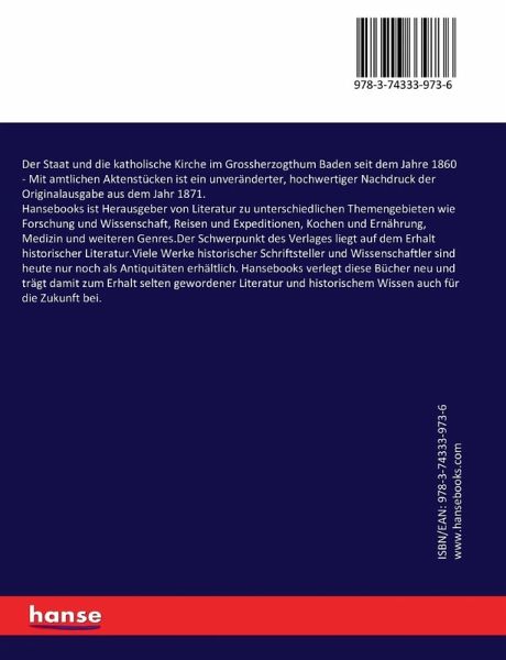 Der Staat und die katholische Kirche im Grossherzogthum Baden seit dem Jahre 1860 - Mit amtlichen Aktenstücken ist ein unveränderter, hochwertiger Nachdruck der Originalausgabe aus dem Jahr 1871.