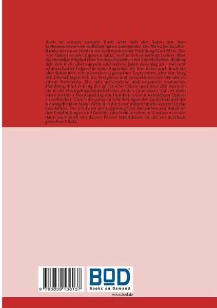 Auch in seinem zweiten Buch setzt sich der Autor mit dem Schleuserunwesen im südlichen Italien auseinander. Die Menschenhändler-Bande, der unser Held in der vorhergehenden Erzählung (Carl Merz, Der rote Faden) so sehr zugesetzt hatte, wollte sich unbedingt rächen. Aber das ehemalige Mitglied einer Sonderpolizeieinheit mit Einzelkämpferausbildung ließ sich nicht überrumpeln und wehrte jeden Anschlag ab - mit sehr schmerzhaften Folgen für seine Angreifer. Als ihm dabei auch noch ein alter Bekannter, ein international gesuchter Topterrorist, über den Weg lief, überschlugen sich die Ereignisse und entwickelten sich beinahe zu einem Horrortrip. Die sehr actionreiche und ungemein spannende Handlung führt entlang der adriatischen Küste quer über den Apennin bis in die Hochgebirgslandschaft des wilden Gran Sasso. Galt es doch einen perfiden Mordanschlag mit Hunderten von unschuldigen Opfern zu verhindern. Durch die genauen Schilderungen der Landschaft und der sie umgebenden Natur fühlt sich der Leser mitten hinein versetzt in das Geschehen. Die Ich-Form der Erzählung lässt ihn unbewusst Anteil an den Empfindungen und Gefühlen des Helden nehmen. Und wenn er sich dann auch noch mit dessen Person identifiziert, ist das ein durchaus gewollter Effekt.