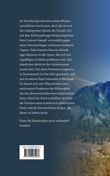 Im Domleschg wird eine schöne Finanzspezialisten erschossen, doch das ist erst der Anfang einer Spirale der Gewalt. Der mit dem Fall beauftragte Kriminalpolizist Reto Caviezel kämpft verzweifelt gegen einen übermächtigen und kaum fassbaren Gegner. Dabei kommt ihm ein übereifriger Reporter in die Quere, der sich mit angriffigen Artikeln profilieren will, sich damit aber direkt in die Gefahrenzone manövriert. Der dem Polizisten vorgesetzte Staatsanwalt ist ihm übel gesonnen, und nur in seinem Team bekommt er Rückhalt. Da kreuzt sich sein Weg mit dem eines entlassenen Professors der Philosophie, der ihn überraschenderweise unterstützen kann. Stück für Stück enthüllen sich ihm die Umrisse eines mörderisch-gefährlichen Deals und die fürchterlichen Folgen, die dieser zu haben droht. Kann die Katastrophe noch verhindert werden?