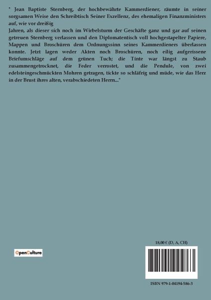 " Jean Baptiste Sternberg, der hochbewährte Kammerdiener, räumte in seiner sorgsamen Weise den Schreibtisch Seiner Exzellenz, des ehemaligen Finanzministers auf, wie vor dreißig Jahren, als dieser sich noch im Wirbelsturm der Geschäfte ganz und gar auf seinen getreuen Sternberg verlassen und den Diplomatentisch voll hochgestapelter Papiere, Mappen und Broschüren dem Ordnungssinn seines Kammerdieners überlassen konnte. Jetzt lagen weder Akten noch Broschüren, noch eilig aufgerissene Briefumschläge auf dem grünen Tuch; die Tinte war längst zu Staub zusammengetrocknet, die Feder verrostet, und die Pendule, von zwei edelsteingeschmückten Mohren getragen, tickte so schläfrig und müde, wie das Herz in der Brust ihres alten, verabschiedeten Herrn..."