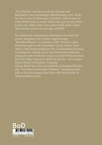 "Der Polizist von heute soll der Freund und Beschützer der anständigen Bevölkerung sein. Nicht so, wie in den verflossenen 12 Jahren. Wenn man da einen Polizisten in seiner Nähe oder gar in sein Haus treten sah, fühlte man sich schon nicht mehr sicher. Man dachte gleich an Gestapo und SD!"So schrieb ein unbekannter Redakteur in einer der ersten Ausgaben des wieder zugelassenen "Hochlandboten" im Sommer 1945. Doch so einen Polizisten gab es im Isarwinkel schon vorher: Paul Mayer, den Kommandanten des Gendarmerie-Postens in Lenggries. Mutig trat er den Nationalsozialisten entgegen und versteckte sogar in seiner Polizeistation fast drei Jahre lang eine jüdische Ärztin - ein in ganz Deutschland einmaliger Vorgang.Dieses Buch fasst seine wechselvolle Lebensgeschichte des "Gerechten unter den Völkern" zusammen und soll so dazu beitragen, dass der stille Held nicht in Vergessenheit gerät.