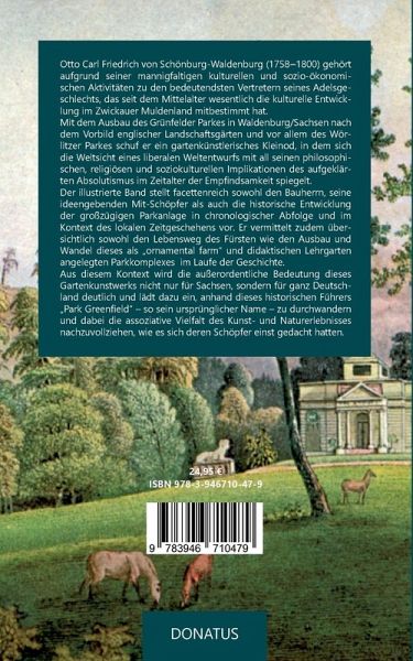 Otto Carl Friedrich von Schönburg-Waldenburg (1758-1800) gehört aufgrund seiner mannigfaltigen kulturellen und sozio-ökonomischen Aktivitäten zu den bedeutendsten Vertretern eines Adelsgeschlechts, das seit dem Mittelalter wesentlich die kulturelle Entwicklung im Zwickauer Muldenland mitbestimmt hatte. Mit dem Ausbau des Grünfelder Parkes in Waldenburg/Sachsen nach dem Vorbild englischer Landschaftsgärten und vor allem des Wörlitzer Parkes schuf er ein gartenkünstlerisches Kleinod, in dem sich die Weltsicht eines liberalen Weltentwurfs mit all seinen philosophischen, religiösen und soziokulturellen Implikationen des aufgeklärten Absolutismus im Zeitalter der Empfindsamkeit spiegelt. Der illustrierte Band stellt facettenreich sowohl den Bauherrn, seine ideengebenden Mit-Schöpfer als auch die historische Entwicklung der großzügigen Parkanlage in chronologischer Abfolge und im Kontext des lokalen Zeitgeschehens vor. Er vermittelt zudem in übersichtlichen Zeittabellen sowohl den Lebensweg des Fürsten wie den Ausbau und Wandel dieses als ornamental farm und didaktischen Lehrgarten angelegten Parkkomplexes im Laufe der Geschichte. Aus diesem Kontext wird die außerordentliche Bedeutung dieses Gartenkunstwerks nicht nur für Sachsen, sondern für ganz Deutschland deutlich und lädt dazu ein, anhand dieses historischen Führers Park Greenfield - so sein ursprünglicher Name - zu durchwandern und dabei die assoziative Vielfalt des Kunst- und Naturerlebnisses nachzuvollziehen, wie es sich deren Schöpfer einst gedacht hatten.
