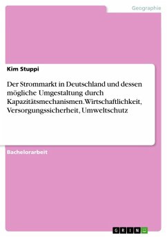 Bachelorarbeit aus dem Jahr 2015 im Fachbereich Geowissenschaften / Geographie - Sonstiges, Note: 2,0, Bayerische Julius-Maximilians-Universität Würzburg (Institut für Geographie und Geologie), Veranstaltung: Energiegeographie, Sprache: Deutsch, Abstract: Das Ziel der Arbeit ist es, einen Einblick in ein eher komplexes System zu geben, dessen Produkt Strom von jedem Menschen in Deutschland verwendet wird. Die meisten wissen jedoch nicht genau, woher dieser denn stammt und wie dieser in einen Haushalt gelangt. Außerdem soll die Arbeit darauf abzielen, die Eckpfeiler des Strommarkts im Hinblick auf die Einführung der derzeit brisant diskutierten Kapazitätsmechanismen vorzustellen. Abgerundet wird die Arbeit mit einem Vergleich, der Länder miteinbezieht, in denen bereits Kapazitätsmechanismen implementiert wurden, um somit nicht nur einen theoretischen, sondern auch einen praktischen Blick auf die Implementierung werfen zu können und um daraus auf mögliche Tipps und Gefahren für Deutschland schließen zu können. Elektrizität zählt heutzutage, nicht nur in Deutschland, zu einem der Grundbedürfnisse der Bürger. Doch stellt es eine äußerst schwierige Aufgabe dar, erzeugten Strom landesweit zur Verfügung zu stellen, beziehungsweise ihn zu verteilen. Da Strom nur sehr kostenintensiv in großen Mengen gespeichert werden kann, gilt es seit Jahrzenten ein System zu entwickeln, das den Strom problemlos zu jeder Zeit in sämtliche Haushalte oder sämtliche Unternehmen transportiert und dabei die Effizienz im Mittelpunkt steht. Dieses System wird Strommarkt genannt, dessen Design für die Erzeugung, den Transport und den Handel der Energie verantwortlich ist. Da sich dieses Design in den letzten Jahrzehnten geändert hat und sich noch weiter verändern wird, gilt es in dieser Arbeit einen genauen Blick auf den früheren und den heutigen, im Wandel befindlichen Strommarkt zu werfen. Des Weiteren werden dessen Aufgaben, Schwierigkeiten und dessen regionale Disparitäten aufgezeigt. Durch Nuklearkatastrophen, den Klimawandel und knapper werdenden fossilen Brennstoffen steigt täglich die Notwendigkeit nach erneuerbaren und somit umweltverträglicheren Energien. Der geplante Atomausstieg wirft jedoch die Frage auf, ob das derzeitige Strommarktdesign auch zukünftig die Versorgungssicherheit gewährleisten könnte. Aus diesem Grund gibt es aktuell zahlreiche Diskussionen um die Einführung von Kapazitätsmechanismen und damit verbunden um eine Umgestaltung des aktuellen Strommarktdesigns, das sich dann um "das magische Dreieck: Wirtschaftlichkeit - Versorgungssicherheit - Umweltschutz" drehen soll.
