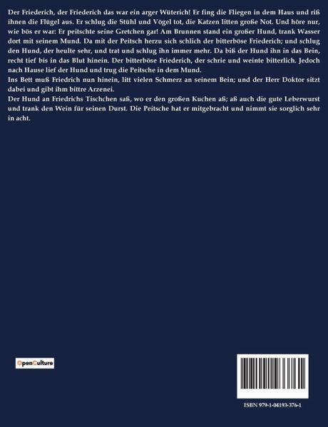Der Friederich, der Friederich das war ein arger Wüterich! Er fing die Fliegen in dem Haus und riß ihnen die Flügel aus. Er schlug die Stühl und Vögel tot, die Katzen litten große Not. Und höre nur, wie bös er war: Er peitschte seine Gretchen gar! Am Brunnen stand ein großer Hund, trank Wasser dort mit seinem Mund. Da mit der Peitsch herzu sich schlich der bitterböse Friederich; und schlug den Hund, der heulte sehr, und trat und schlug ihn immer mehr. Da biß der Hund ihn in das Bein, recht tief bis in das Blut hinein. Der bitterböse Friederich, der schrie und weinte bitterlich. Jedoch nach Hause lief der Hund und trug die Peitsche in dem Mund. Ins Bett muß Friedrich nun hinein, litt vielen Schmerz an seinem Bein; und der Herr Doktor sitzt dabei und gibt ihm bittre Arzenei. Der Hund an Friedrichs Tischchen saß, wo er den großen Kuchen aß; aß auch die gute Leberwurst und trank den Wein für seinen Durst. Die Peitsche hat er mitgebracht und nimmt sie sorglich sehr in acht.