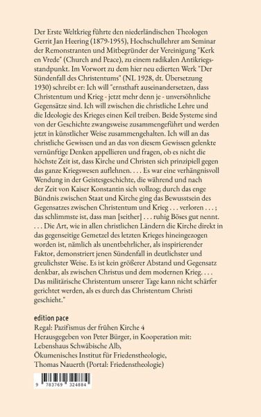 Der Erste Weltkrieg führte den niederländischen Theologen Gerrit Jan Heering (1879-1955), Hochschullehrer am Seminar der Remonstranten und Mitbegründer der Vereinigung "Kerk en Vrede" (Church and Peace), zu einem radikalen Antikriegsstandpunkt. Im Vorwort zu dem hier neu edierten Werk "Der Sündenfall des Christentums" (Erstauflage NL 1928, dt. Übersetzung 1930) schreibt er: Ich will "ernsthaft auseinandersetzen, dass Christentum und Krieg - jetzt mehr denn je - unversöhnliche Gegensätze sind. Ich will zwischen die christliche Lehre und die Ideologie des Krieges einen Keil treiben. Beide Systeme sind von der Geschichte zwangsweise zusammengeführt und werden jetzt in künstlicher Weise zusammengehalten. Ich will an das christliche Gewissen und an das von diesem Gewissen gelenkte vernünftige Denken appellieren und fragen, ob es nicht die höchste Zeit ist, dass Kirche und Christen sich prinzipiell gegen das ganze Kriegswesen auflehnen. ... Es war eine verhängnisvolle Wendung in der Geistesgeschichte, die während und nach der Zeit von Kaiser Konstantin sich vollzog; durch das enge Bündnis zwischen Staat und Kirche ging das Bewusstsein des Gegensatzes zwischen Christentum und Krieg ... verloren ...; das schlimmste ist, dass man (seither) ... ruhig Böses gut nennt. ... Die Art, wie in allen christlichen Ländern die Kirche direkt in das gegenseitige Gemetzel des letzten Krieges hineingezogen worden ist, nämlich als unentbehrlicher, als inspirierender Faktor, demonstriert jenen Sündenfall in deutlichster und greulichster Weise. Es ist kein größerer Abstand und Gegensatz denkbar, als zwischen Christus und dem modernen Krieg. Wer dies verneint, hat die Realität eines von beiden oder beider nicht klar gesehen. Das militärische Christentum unserer Tage kann nicht schärfer gerichtet werden, als es durch das Christentum Christi geschieht." edition pace. Regal: Pazifismus der frühen Kirche 4. Herausgegeben von Peter Bürger, In Kooperation mit: Lebenshaus Schwäbische Alb, Ökumenisches Institut für Friedenstheologie, Thomas Nauerth (Portal: Friedenstheologie).