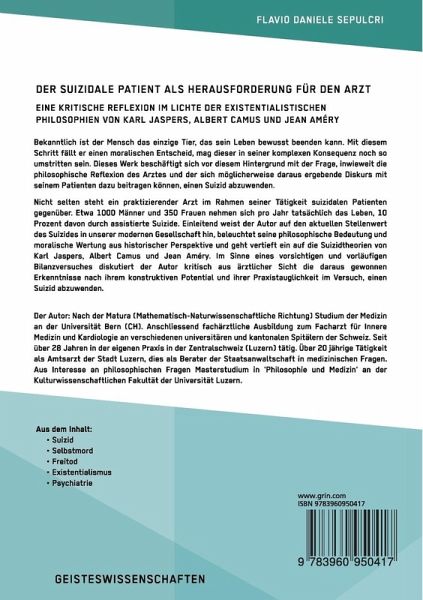 Bekanntlich ist der Mensch das einzige Tier, das sein Leben bewusst beenden kann. Mit diesem Schritt fällt er einen moralischen Entscheid, mag dieser in seiner komplexen Konsequenz noch so umstritten sein. Dieses Werk beschäftigt sich vor diesem Hintergrund mit der Frage, inwieweit die philosophische Reflexion des Arztes und der sich möglicherweise daraus ergebende Diskurs mit seinem Patienten dazu beitragen können, einen Suizid abzuwenden.Nicht selten steht ein praktizierender Arzt im Rahmen seiner Tätigkeit suizidalen Patienten gegenüber. Etwa 1000 Männer und 350 Frauen nehmen sich pro Jahr tatsächlich das Leben, 10 Prozent davon durch assistierte Suizide. Einleitend wird auf den aktuellen Stellenwert des Suizides in unserer modernen Gesellschaft hingewiesen, seine philosophische Bedeutung und moralische Wertung aus historischer Perspektive beleuchtet sowie vertieft auf die Suizidtheorien von Karl Jaspers, Albert Camus und Jean Améry eingegangen. Im Sinne eines vorsichtigen undvorläufigen Bilanzversuches werden die daraus gewonnen Erkenntnisse nach ihrem konstruktiven Potential und ihrer Praxistauglichkeit im Versuch einen Suizid abzuwenden aus ärztlicher Sicht kritisch diskutiert.Aus dem Inhalt:- Suizid;- Selbstmord;- Freitod;- Existentialismus;- Psychiatrie