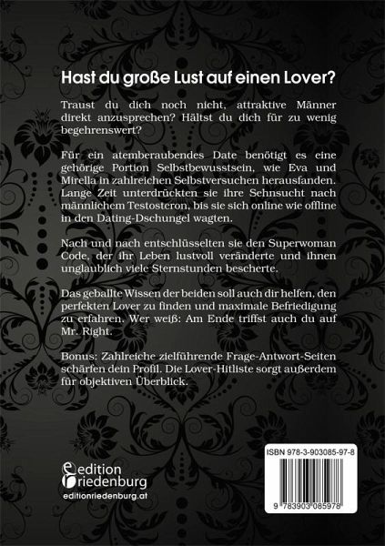 Hast du große Lust auf einen Lover? Traust du dich noch nicht, attraktive Männer direkt anzusprechen? Hältst du dich für zu wenig begehrenswert? Für ein atemberaubendes Date benötigt es eine gehörige Portion Selbstbewusstsein, wie Eva und Mirella in zahlreichen Selbstversuchen herausfanden. Lange Zeit unterdrückten sie ihre Sehnsucht nach männlichem Testosteron, bis sie sich online wie offline in den Dating-Dschungel wagten. Nach und nach entschlüsselten sie den Superwoman Code, der ihr Leben lustvoll veränderte und ihnen unglaublich viele Sternstunden bescherte.Das geballte Wissen der beiden soll auch dir helfen, den perfekten Lover zu finden und maximale Befriedigung zu erfahren. Wer weiß: Am Ende triffst auch du auf Mr. Right.Bonus: Zahlreiche zielführende Frage-Antwort-Seiten schärfen dein Profil. Die Lover-Hitliste sorgt außerdem für objektiven Überblick.