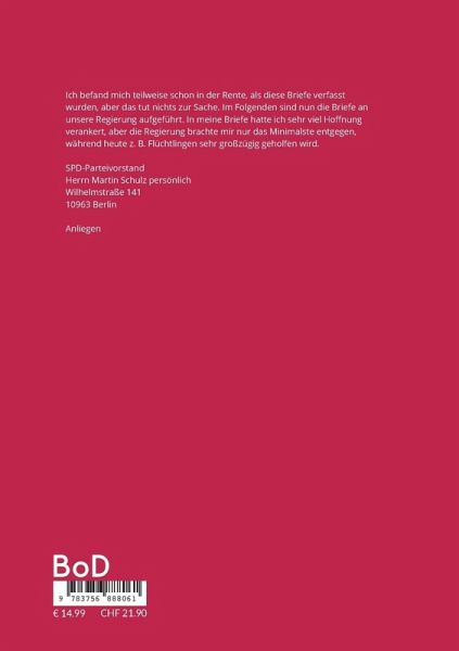 Ich befand mich teilweise schon in der Rente, als diese Briefe verfasst wurden, aber das tut nichts zur Sache. Im Folgenden sind nun die Briefe an unsere Regierung aufgeführt. In meine Briefe hatte ich sehr viel Hoffnung verankert, aber die Regierung brachte mir nur das Minimalste entgegen, während heute z. B. Flüchtlingen sehr großzügig geholfen wird. SPD-Parteivorstand Herrn Martin Schulz persönlich Wilhelmstraße 141 10963 Berlin Anliegen Sehr geehrter Herr Martin Schulz, es ist manchmal nicht leicht für mich,