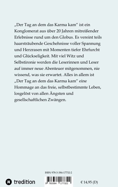 "Der Tag an dem das Karma kam" ist ein Konglomerat aus über 20 Jahren mitreißender Erlebnisse rund um den Globus.Es vereint teils haarsträubende Geschehnisse voller Spannung und Herzrasen mit Momenten tiefer Ehrfurcht und Glückseligkeit.Mit viel Witz und Selbstironie werden die Leserinnen und Leser auf immer neue Abenteuer mitgenommen, nie wissend, was sie erwartet.