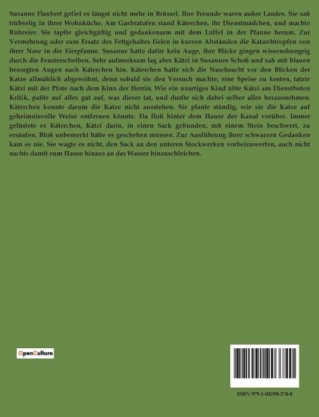 Susanne Flaubert gefiel es längst nicht mehr in Brüssel. Ihre Freunde waren außer Landes. Sie saß trübselig in ihrer Wohnküche. Am Gasbratofen stand Käterchen, ihr Dienstmädchen, und machte Rühreier. Sie tapfte gleichgültig und gedankenarm mit dem Löffel in der Pfanne herum. Zur Vermehrung oder zum Ersatz des Fettgehaltes fielen in kurzen Abständen die Katarrhtropfen von ihrer Nase in die Eierpfanne. Susanne hatte dafür kein Auge, ihre Blicke gingen wissenshungrig durch die Fensterscheiben. Sehr aufmerksam lag aber Kätzi in Susannes Schoß und sah mit blauen besorgten Augen nach Käterchen hin. Käterchen hatte sich die Naschsucht vor den Blicken der Katze allmählich abgewöhnt, denn sobald sie den Versuch machte, eine Speise zu kosten, tatzte Kätzi mit der Pfote nach dem Kinn der Herrin. Wie ein unartiges Kind übte Kätzi am Dienstboten Kritik, paßte auf alles gut auf, was dieser tat, und durfte sich dabei selber alles herausnehmen. Käterchen konnte darum die Katze nicht ausstehen. Sie plante ständig, wie sie die Katze auf geheimnisvolle Weise entfernen könnte. Da floß hinter dem Hause der Kanal vorüber. Immer gelüstete es Käterchen, Kätzi darin, in einen Sack gebunden, mit einem Stein beschwert, zu ersäufen. Bloß unbemerkt hätte es geschehen müssen. Zur Ausführung ihrer schwarzen Gedanken kam es nie. Sie wagte es nicht, den Sack an den unteren Stockwerken vorbeizuwerfen, auch nicht nachts damit zum Hause hinaus an das Wasser hinzuschleichen.