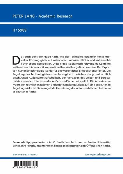 Das Buch geht der Frage nach, wie der Technologietransfer konventioneller Rüstungsgüter auf nationaler, unionsrechtlicher und völkerrechtlicher Ebene geregelt ist. Diese Frage ist praktisch relevant, da Konflikte weltweit noch immer mit konventionellen Waffen geführt werden. Der Export von Rüstungstechnologie ist hierfür ein wesentlicher Ermöglichungsfaktor. Die Regelung des Technologietransfers bewegt sich zwischen der grundrechtlich geschützten Außenwirtschaftsfreiheit, den Vorgaben des Völker- und Europarechts sowie den Interessen der Außen- und Sicherheitspolitik. Die Autorin analysiert den rechtlichen Rahmen und zeigt Regelungslücken auf. Eine bedeutende Regelungslücke ist die mangelnde Umsetzung der rechtlich verbindlichen unionsrechtlichen Leitlinien in deutsches Recht.