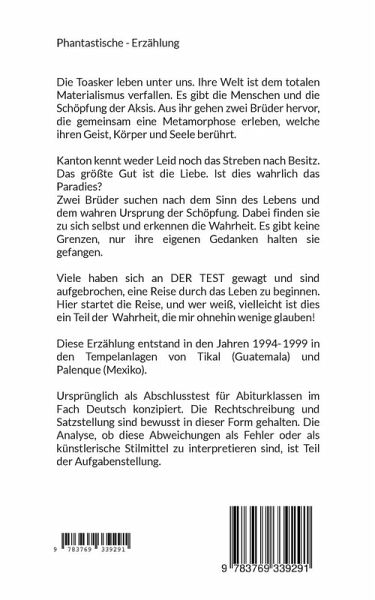 Phantastische-Erzählung Die Toasker leben in einer immateriellen Welt. Aus ihr gehen zwei Brüder hervor, Isac und Kolke, gemeinsam erleben sie eine Metamorphose die Ihren Geist, Körper und Seele berührt, wie niemand anders je zuvor. Kolke - Der Ältere, Eroberer, Erlöser der Tradition. Isac - Der Jüngere, Nachdenkliche, Bewahrer der Tradition. Inhalt Eine Welt in der es kein Leid gibt, kein Streben nach Besitz, in der das größte Gut die Liebe ist, es nur den Menschen und die Schöpfung gibt. Wahrlich das Paradies? Zwei Brüder machen sich auf, den Sinn des Lebens und den wahren Ursprung der Schöpfung zu finden. Dabei finden sie sich selbst und die Wahrheit, das es keine Grenzen gibt, nur ihre eigene Schöpfung hält sie im Bann. Dieses Buch ist nach dem Sie so lange gesucht haben. Nun, es gibt nur den einen Weg Entscheidungen zu treffen. Sie zu treffen. Es gab deren viele, die sich am DER TEST geschieden haben und aufgebrochen sind eine Reise durch das Leben zu beginnen. Hier beginnt die Reise und wer weiß vielleicht ist dies die Wahrheit, die mir sowieso keiner glaubt! Das Buch wendet sich an alle die Grammatik- und Rechtschreibprobleme haben. Satzstellungen sind meistens falsch. Es muss korrigiert werden. Der Name ist Konzept. Stimmen von Verlegern: Ich habe Ihre Arbeit in der Zwischenzeit gelesen und bin davon beeindruckt. Es ist eine außergewöhnlich fantasiereiche Erzählung. Die Welt, in die der Leser entrückt wird, ist sehr kunstvoll beschrieben; die Kultur wird ohne logische Brüche und ohne lange Exkurse dargestellt; ihre Konturen ergeben sich gewissermaßen im Lauf der Erzählung von allein. Auch die Handlung selbst ist spannend und philosophisch sinnreich. Die Zeit wird zeigen ob es sich hier um ein Standardwerk der Neuen philosophischen Erzählung des 21. Jahrhundert handelt. Zuerst fühlte ich mich erschlagen von der Sichtweise eines der Protagonisten. Dann klärte sich schnell, wie unsere Welt auch zu sehen ist.