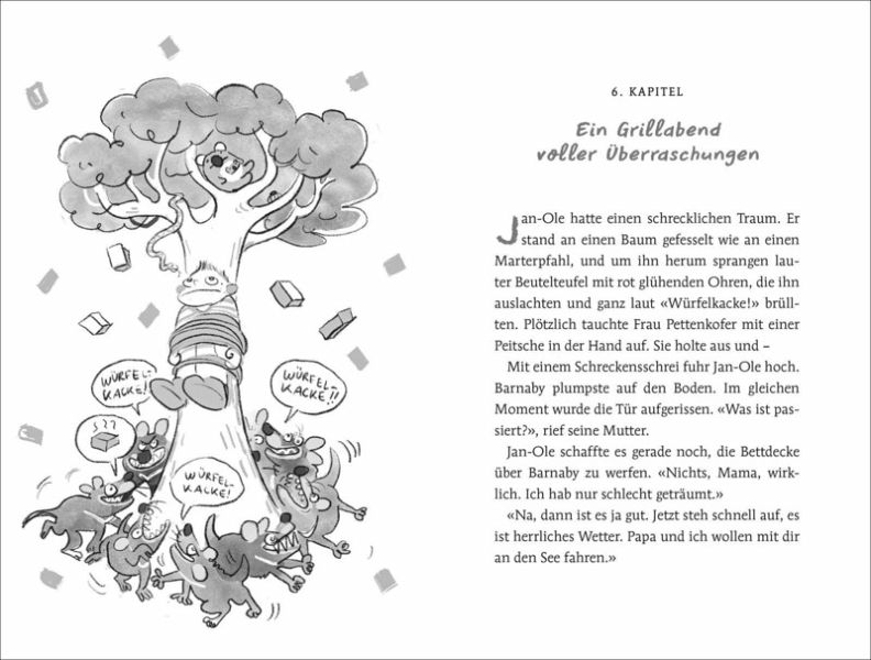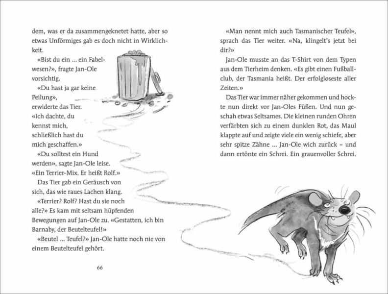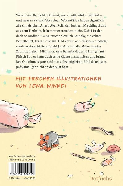 Eigentlich bekommt Jan-Ole immer alles, was er sich wünscht. Und wenn nicht, wird Jan-Ole wütend, und zwar so richtig! Vor seinen Wutanfällen haben eigentlich alle ein bisschen Angst. Trotzdem wollen ihm seine Eltern zum Geburtstag keinen Hund schenken - dabei ist Rolf, der Mischling aus dem Tierheim, doch so niedlich! Und dann taucht plötzlich Barnaby, der Beutelteufel, bei Jan-Ole auf - und Barnaby ist kein bisschen niedlich, sondern ein echt fieses Vieh! Jan-Ole hat alle Mühe, ihn im Zaum zu halten! Nicht nur, dass Barnaby dauernd Hunger auf Fleisch hat, er kann auch seine Klappe nicht halten und bringt Jan-Ole oftmals ganz schön in Schwierigkeiten. Und dabei ist es ja diesmal gar nicht er, der Mist baut ...