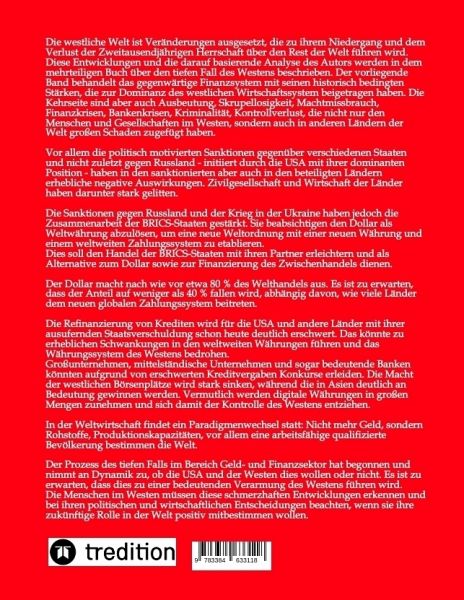 Die westliche Welt ist Veränderungen ausgesetzt, die zu ihrem Niedergang und dem Verlust der Zweitausendjährigen Herrschaft über den Rest der Welt führen wird. Diese Entwicklungen und die darauf basierende Analyse des Autors werden in dem mehrteiligen Buch über den tiefen Fall des Westens beschrieben. Der vorliegende Band behandelt das gegenwärtige Finanzsystem mit seinen historisch bedingten Stärken, die zur Dominanz des westlichen Wirtschaftssystem beigetragen haben. Die Kehrseite sind aber auch Ausbeutung, Skrupellosigkeit, Machtmissbrauch, Finanzkrisen, Bankenkrisen, Kriminalität, Kontrollverlust, die nicht nur den Menschen und Gesellschaften im Westen, sondern auch in anderen Ländern der Welt großen Schaden zugefügt haben. Vor allem die politisch motivierten Sanktionen gegenüber verschiedenen Staaten und nicht zuletzt gegen Russland - initiiert durch die USA mit ihrer dominanten Position - haben in den sanktionierten aber auch in den beteiligten Ländern erhebliche negativeAuswirkungen. Zivilgesellschaft und Wirtschaft der Länder haben darunter stark gelitten. Die Sanktionen gegen Russland und der Krieg in der Ukraine haben jedoch die Zusammenarbeit der BRICS-Staaten gestärkt. Sie beabsichtigen den Dollar als Weltwährung abzulösen, um eine neue Weltordnung mit einer neuen Währung und einem weltweiten Zahlungssystem zu etablieren.Dies soll den Handel der BRICS-Staaten mit ihren Partner erleichtern und als Alternative zum Dollar sowie zur Finanzierung des Zwischenhandels dienen. Der Dollar macht nach wie vor etwa 80 % des Welthandels aus. Es ist zu erwarten, dass der Anteil auf weniger als 40 % fallen wird, abhängig davon, wie viele Länder dem neuen globalen Zahlungssystem beitreten. Die Refinanzierung von Krediten wird für die USA und andere Länder mit ihrer ausufernden Staatsverschuldung schon heute deutlich erschwert. Das könnte zu erheblichen Schwankungen in den weltweiten Währungen führen und das Währungssystem des Westens bedrohen. Großunternehmen, mittelständische Unternehmen und sogar bedeutende Banken könnten aufgrund von erschwerten Kreditvergaben Konkurse erleiden. Die Macht der westlichen Börsenplätze wird stark sinken, während die in Asien deutlich an Bedeutung gewinnen werden. Vermutlich werden digitale Währungen in großen Mengen zunehmen und sich damit der Kontrolle des Westens entziehen. In der Weltwirtschaft findet ein Paradigmenwechsel statt: Nicht mehr Geld, sondern Rohstoffe, Produktionskapazitäten, vor allem eine arbeitsfähige qualifizierte Bevölkerung bestimmen die Welt. Der Prozess des tiefen Falls im Bereich Geld- und Finanzsektor hat begonnen und nimmt an Dynamik zu, ob die USA und der Westen dies wollen oder nicht. Es ist zu erwarten, dass dies zu einer bedeutenden Verarmung des Westens führen wird. Die Menschen im Westen müssen diese schmerzhaften Entwicklungen erkennen und bei ihren politischen und wirtschaftlichen Entscheidungen beachten, wenn sie ihre zukünftige Rolle in der Welt positiv mitbestimmen wollen.