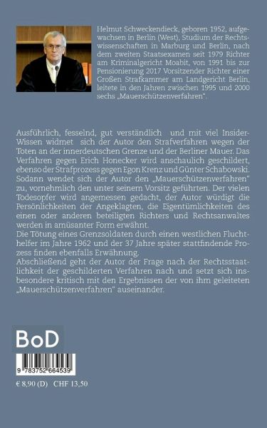 Ausführlich, fesselnd, gut verständlich und mit viel Insider-Wissen widmet sich der Autor den Strafverfahren wegen der Toten an der innerdeutschen Grenze und der Berliner Mauer. Das Verfahren gegen Erich Honecker wird anschaulich geschildert, ebenso der Strafprozess gegen Egon Krenz und Günter Schabowski. Sodann wendet sich der Autor den "Mauerschützenverfahren" zu, vornehmlich den unter seinem Vorsitz geführten. Der vielen Todesopfer wird angemessen gedacht, der Autor würdigt die Persönlichkeiten der Angeklagten, die Eigentümlichkeiten des einen oder anderen beteiligten Richters und Rechtsanwaltes werden in amüsanter Form erwähnt. Die Tötung eines Grenzsoldaten durch einen westlichen Fluchthelfer im Jahre 1962 und der 37 Jahre später stattfindende Prozess finden ebenfalls Erwähnung.Abschließend geht der Autor der Frage nach der Rechtsstaatlichkeit der geschilderten Verfahren nach und setzt sich insbesondere kritisch mit den Ergebnissen der von ihm geleiteten "Mauerschützenverfahren" auseinander.