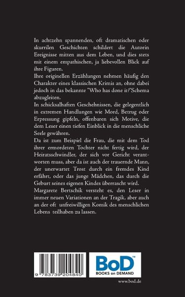 In achtzehn spannenden, oft tragischen oder skurrilen Geschichten schildert die Autorin Ereignisse mitten aus dem Leben, und dies stets mit einem empathischen, ja liebevollen Blick auf ihre Figuren. Ihre originellen Erzählungen nehmen häufig den Charakter eines klassischen Krimis an, ohne dabei jedoch in das bekannte "Who has done it?"-Schema abzugleiten.In schicksalhaften Geschehnissen, die gelegentlich in extremen Handlungen wie Mord, Betrug oder anderen kriminellen Taten gipfeln, offenbaren sich Motive, die einen tiefen Einblick in die menschliche Seele gewähren.Da ist zum Beispiel die Frau, die mit dem Tod ihrer ermordeten Tochter nicht fertig wird, der Heiratsschwindler, der sich vor Gericht verantworten muss, aber da ist auch der trauernde Mann, der unerwartet Trost durch ein fremdes Kind erfährt, oder das junge Mädchen, das durch die Geburt seines eigenen Kindes überrascht wird.Margarete Bertschik versteht es, in immer neuen Variationen die Tragik, aber auch die unfreiwillige Komik des menschlichen Lebens vor den Augen des Lesers lebendig werden zu lassen.
