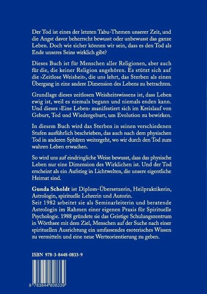 Der Tod ist eines der letzten Tabu-Themen unserer Zeit, und die Angst davor beherrscht bewusst oder unbewusst das ganze Leben. Doch wie sicher können wir sein, dass es den Tod als Ende unseres Seins wirklich gibt?Dieses Buch ist für Menschen aller Religionen, aber auch für die, die keiner Religion angehören. Es stützt sich auf die 'Zeitlose Weisheit', die uns lehrt, das Sterben als einen Übergang in eine andere Dimension des Lebens zu betrachten. Grundlage dieses zeitlosen Weisheitswissens ist, dass Leben ewig ist, weil es niemals begann und niemals enden kann. Und dieses 'Eine Leben' manifestiert sich im Kreislauf von Geburt, Tod und Wiedergeburt, um Evolution zu bewirken.In diesem Buch wird das Sterben in seinen verschiedenen Stufen ausführlich beschrieben, das auch nach dem physischen Tod in anderen Sphären weitergeht, wo wir durch den Tod zum wahren Leben erwachen.So wird uns auf eindringliche Weise bewusst, dass das physische Leben nur eine Dimension des Wirklichen ist. Und der Tod erscheint als ein Aufstieg in Lichtwelten, die unsere eigentliche Heimat sind.