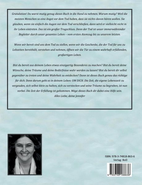Vielleicht ist die größte Angst, die wir Menschen in uns tragen, die vor dem Tod. Die Kraft, die unser Leben beendet. Die Kraft, die endgültig ist. Sie wird kommen zu jedem einzelnen von uns. Doch wir wissen nicht wann und wie. Wir schieben den Tod beiseite. Versuchen ihn aus unserem Leben herauszuhalten und nicht tiefer über ihn nachzudenken. Und vergessen dabei, dass der Tod allgegenwärtig in unserem Leben ist. Im Laufe unseres Lebens durchlaufen wir ständigen Stirb-und Werde-Prozessen. Das Kind stirbt, damit es als Erwachsender das Leben neu ergreifen kann. Ein Teil der Frau stirbt, um als Mutter neu geboren zu werden. Der Single stirbt, um sich als Teil eines Paares neu zu definieren. Das Gestern ist gestorben, das Morgen noch nicht geboren und im Jetzt halten wir die Fäden unserer Lebensgestaltung in den Händen. Der Tod ist allgegenwärtig in unserem Leben- vom ersten Atemzug bis zum letzten.Wenn wir das verstehen, wenn wir endlich bereit sind die Augen zu öffnen, um uns der Kraft des Todes zu stellen, dann erhalten wir vielleicht das größte Geschenk, welches wir erfahren dürfen: wirklich zu leben.Der Tod ist der Schlüssel zum Leben. Zu einem erfüllten, reichen und bewussten Leben. Wenn wir den Tod erfassen, begreifen wir das Leben und werden so zu einem wundervollen Schöpfer unserer kostbaren Lebenszeit. Es gibt nichts mehr zu vergeuden. Zeit den Tod als Freund an unserer Seite zu verstehen, der uns hilft wahrhaft zu leben.Dieses Buch ist eine Reise zu dir selbst. Es ist kein reines Lesebuch, sondern ein Erfahrungsbuch, ein Selbst-Entdeckungsbuch, welches du individuell und einzigartig ergreifen und gestalten kannst. Möge dein Leben wundervoll sein. Mögest du dein Leben lieben und das Beste und Schönste daraus machen. Deine Jennifer Weidmann