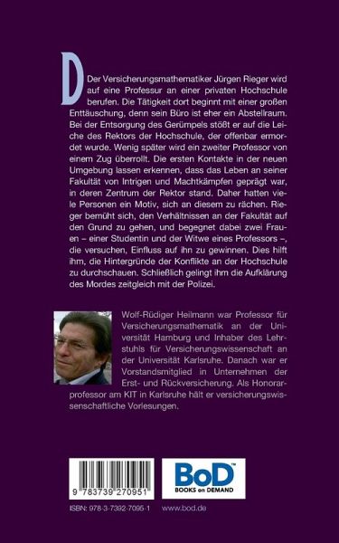 Der Versicherungsmathematiker Jürgen Rieger wird auf eine Professur an einer privaten Hochschule berufen. Die Tätigkeit dort beginnt mit einer großen Enttäuschung, denn sein Büro ist eher ein Abstellraum. Bei der Entsorgung des Gerümpels stößt er auf die Leiche des Rektors der Hochschule, der offenbar ermordet wurde. Wenig später wird ein zweiter Professor von einem Zug überrollt. Die ersten Kontakte in der neuen Umgebung lassen erkennen, dass das Leben an seiner Fakultät von Intrigen und Machtkämpfen geprägt war, in deren Zentrum der Rektor stand. Daher hatten viele Personen ein Motiv, sich an diesem zu rächen. Rieger bemüht sich, den Verhältnissen an der Fakultät auf den Grund zu gehen, und begegnet dabei zwei Frauen - einer Studentin und der Witwe eines Professors -, die versuchen, Einfluss auf ihn zu gewinnen. Dies hilft ihm, die Hintergründe der Konflikte an der Hochschule zu durchschauen. Schließlich gelingt ihm die Aufklärung des Mordes zeitgleich mit der Polizei.