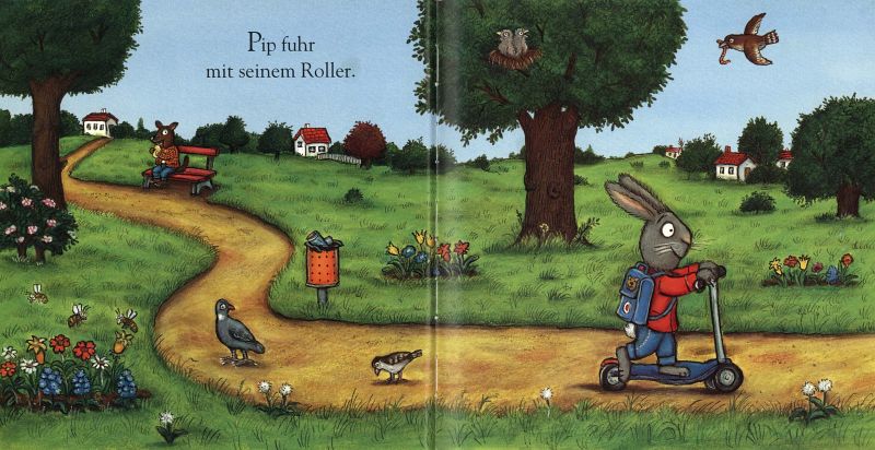 Pip ist ein grauer Hasenjunge, Posy ein braunes Mäusemädchen. Sie sind noch klein, und sie sind Freunde. Beide haben ein liebstes Kuscheltier: Posy fährt ihren Schmusefrosch im Tierkinder-Buggy spazieren, Pip hat sein Stoffschwein im Rucksack dabei. Die Familienverhältnisse der beiden sind unklar. Posy wohnt in einem gelben Haus, und wenn dort gebadet wird, schüttet sie ungefähr eine Dreiviertelflasche Schaumseife ins Wasser. Von Eltern keine Spur: Als Pip vor lauter Spielen vergisst, dass er mal Pipi muss, und eine kleine Pfütze auf Posys Wohnzimmerboden macht, ist es die Freundin, die den Wischmob holt und sagt: "Macht doch nichts. Kann jedem mal passieren." Als Posy beim Rollerfahren stürzt und weint und am Knie blutet, ist es Pip, der sie tröstet und verarztet. Im Rucksack hat er nämlich auch ein Pflaster.