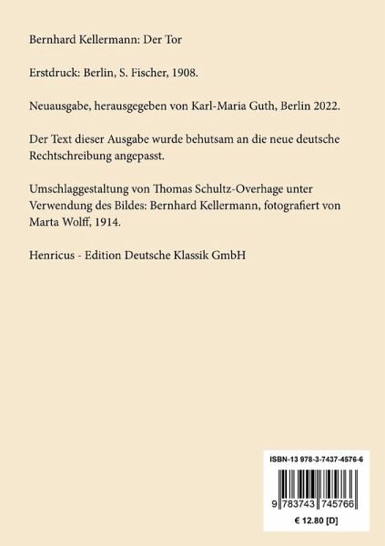 Bernhard Kellermann: Der TorErstdruck: Berlin, S. Fischer, 1908.Neuausgabe, herausgegeben von Karl-Maria Guth, Berlin 2023.Der Text dieser Ausgabe wurde behutsam an die neue deutsche Rechtschreibung angepasst.Umschlagabbildung: Bernhard Kellermann, fotografiert von Marta Wolff, 1914Gesetzt aus der Minion Pro, 11 pt.Die Sammlung Hofenberg erscheint im Verlag Henricus - Edition Deutsche Klassik GmbH, Berlin