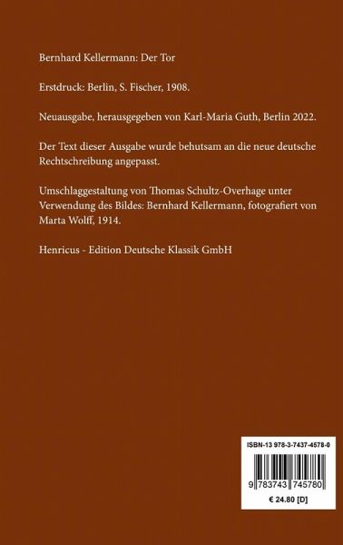 Bernhard Kellermann: Der TorErstdruck: Berlin, S. Fischer, 1908.Neuausgabe, herausgegeben von Karl-Maria Guth, Berlin 2023.Der Text dieser Ausgabe wurde behutsam an die neue deutsche Rechtschreibung angepasst.Umschlagabbildung: Bernhard Kellermann, fotografiert von Marta Wolff, 1914Gesetzt aus der Minion Pro, 11 pt.Die Sammlung Hofenberg erscheint im Verlag Henricus - Edition Deutsche Klassik GmbH, Berlin